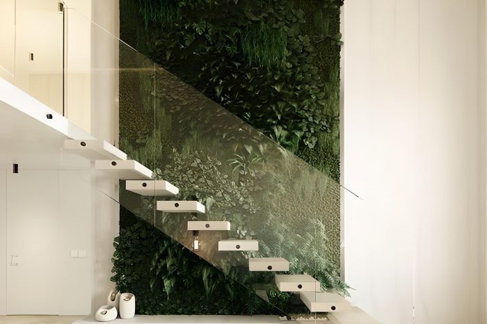 Materials in neutral colors are chosen, with the aim of highlighting the staircase as the main sculptural element, in which the steps seem to be born from the vegetation behind them.