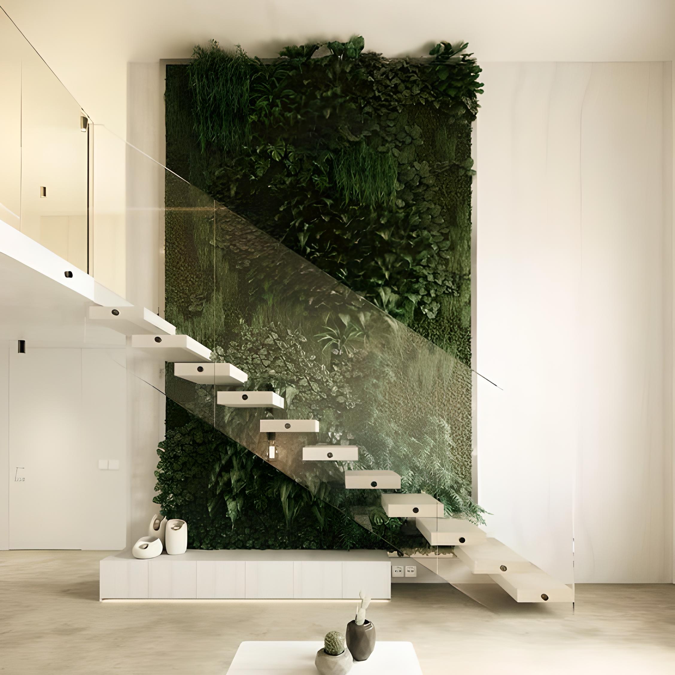 Se opta por materiales en colores neutros, con el objetivo de destacar la escalera como elemento escultórico protagonista, en el que los peldaños parecen nacer de la vegetación que hay tras ellos.