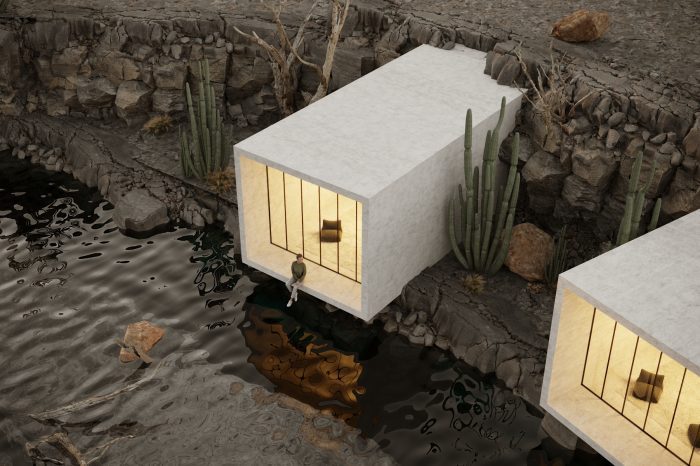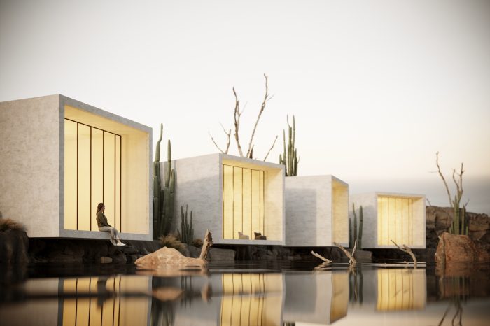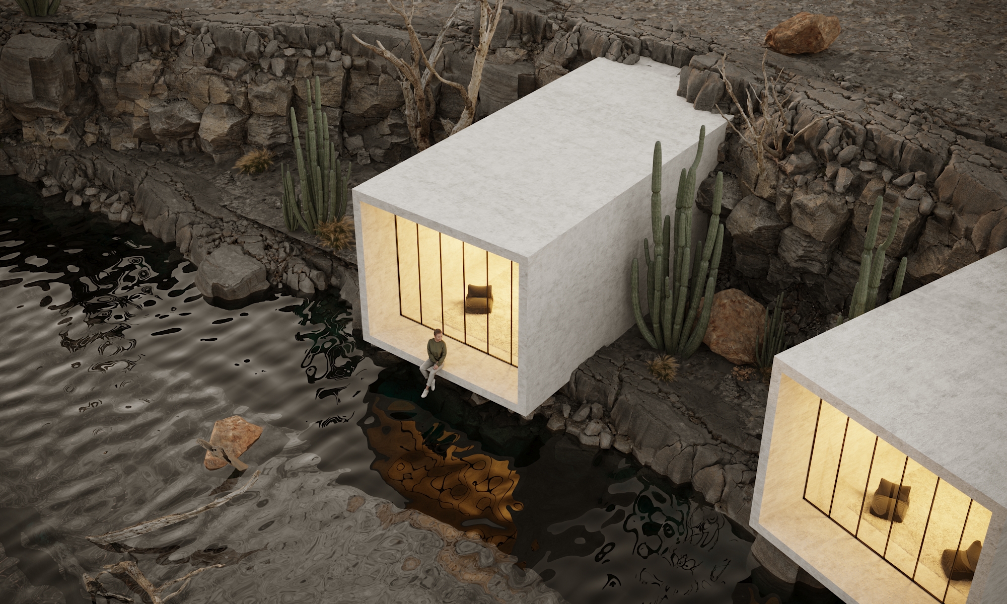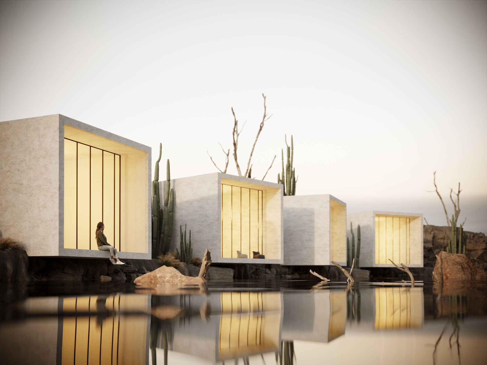 It is a set of rural houses, each clearly defined by a very geometric element that seeks to contemplate the lake that is located in front of them. The staggered terrain is use to cause each of the pieces to emerge from it, creating different spaces depending on the level of privacity.
