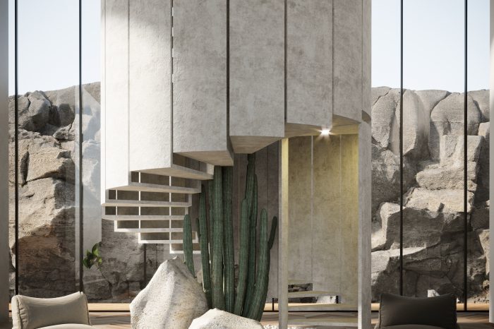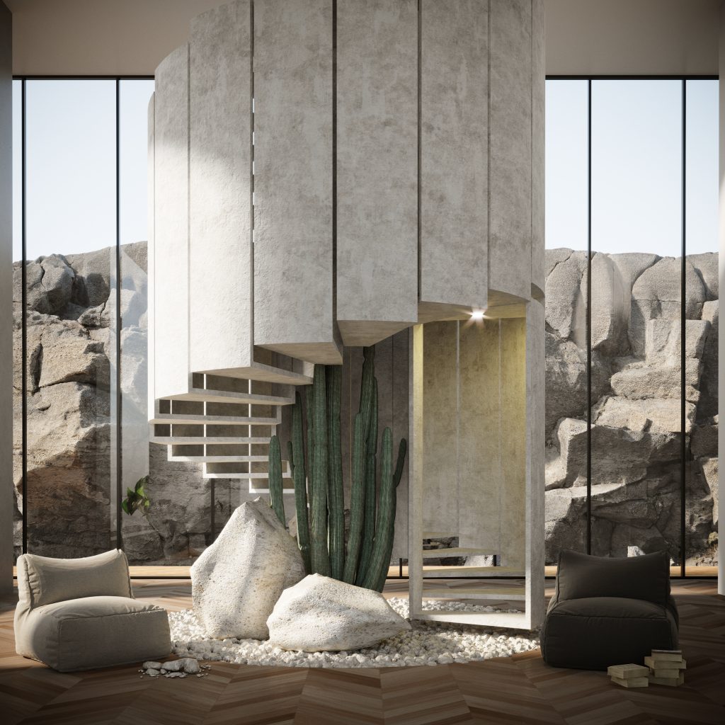 As a common element to them, there is a sculptural staircase that aims to establish a link between each house and also serves as a reception and welcome space.